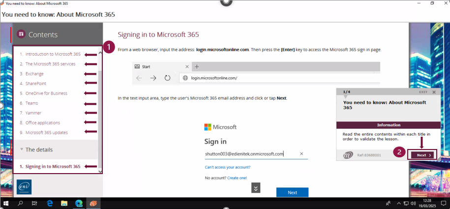 A colour scheme indicates the success level of the topic concerned. For "You need to know" topics, the colour indicates whether all the information has been properly viewed.