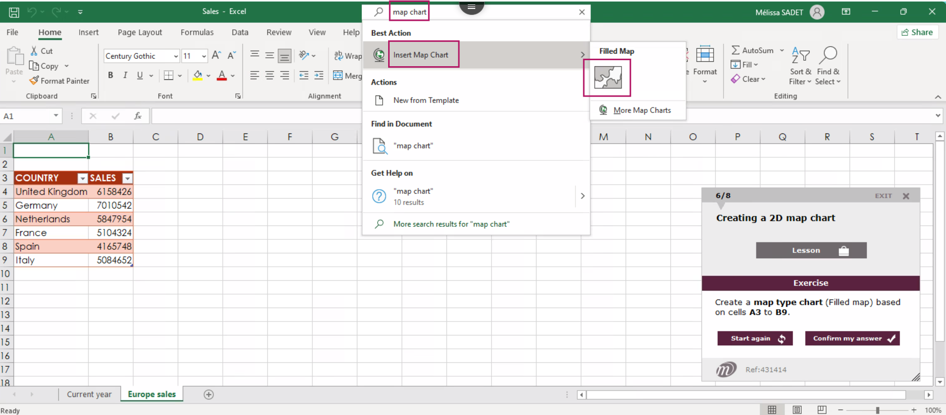 - Use the Excel search bar: type ‘map chart’ to go directly to the corresponding option, as shown below.